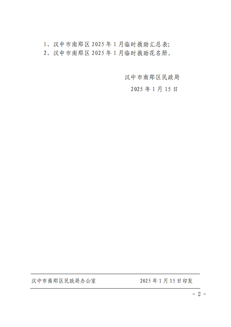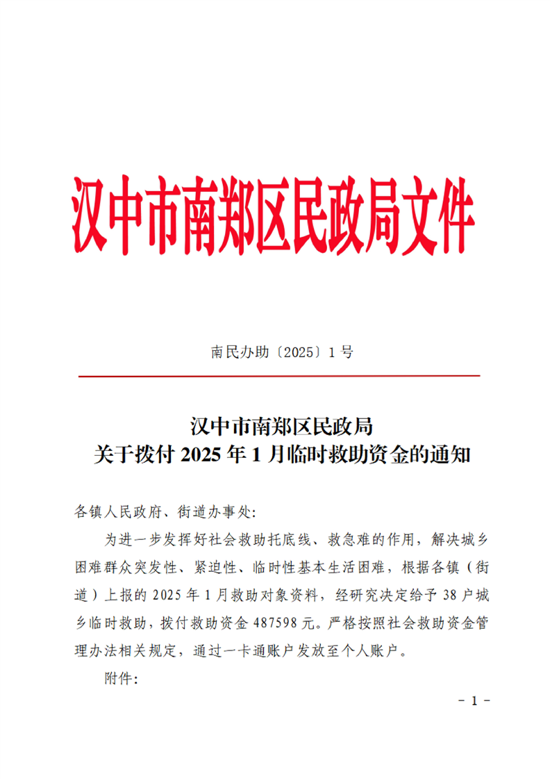 汉中市南郑区民政局关于拨付2025年1月临时救助资金的通知