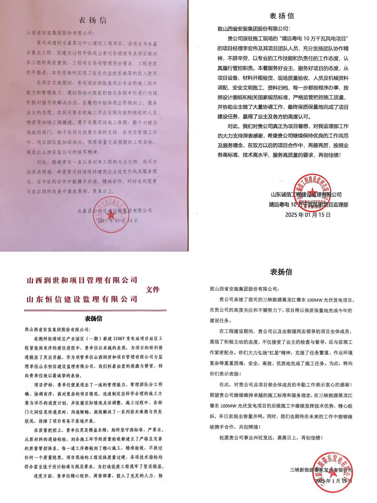 1月14日以来,西北工程公司喜讯频传,接续收到三峡新能源肇东发电公司、山西润世和项目管理有限公司、山东恒信建设监理有限公司、永嘉公共交通运输集团、山东诚信工程建设监理有限公司等多家单位表扬信。