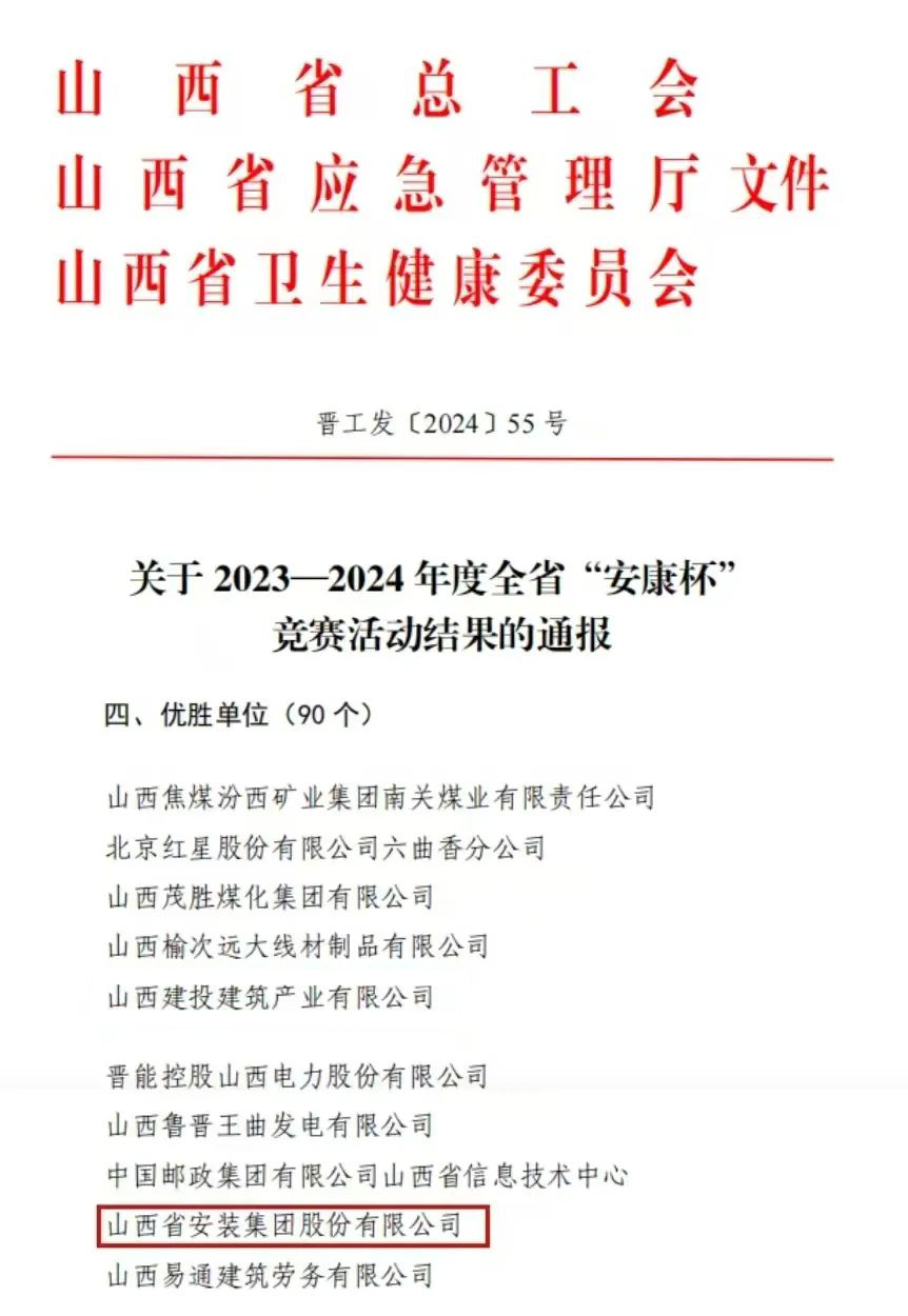喜报!集团荣获2023—2024年度山西省“安康杯”竞赛“优胜单位”荣誉称号