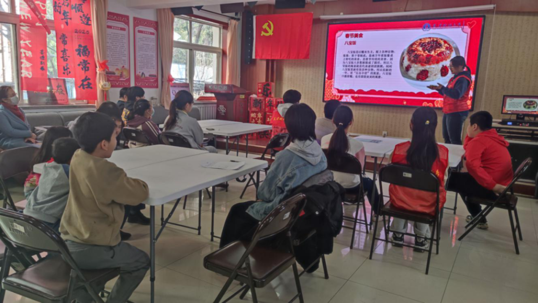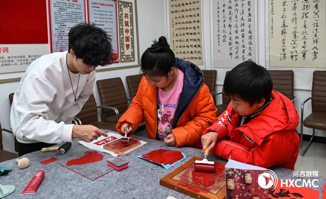 大营门街道蚌埠道社区联合天津财经大学志愿者协会开展“争当中华文化守护者”志愿服务活动。大学生志愿者为青少年们讲解春节的起源与习俗,介绍春联、福字和窗花等传统文化元素的起源和寓意。现场,青少年们和家长一起进行福字拓印,感受非遗文化魅力。