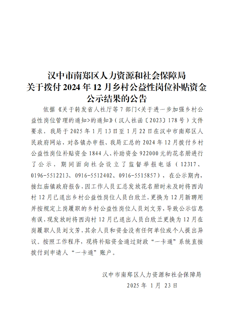 汉中市南郑区人力资源和社会保障局关于拨付2024年12月乡村公益性岗位补贴资金公示结果的公告