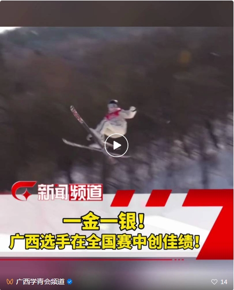 1月18日,广西选手在2024—2025赛季全国自由式滑雪坡面障碍技巧锦标赛和全国单板滑雪大跳台锦标赛创佳绩。其中,肖思雨(鹿寨籍)在自由式滑雪坡面障碍技巧项目中获女子组冠军,甘佳佳在单板滑雪大跳台项目中获女子组亚军。