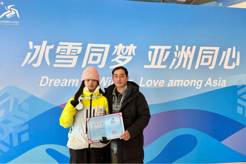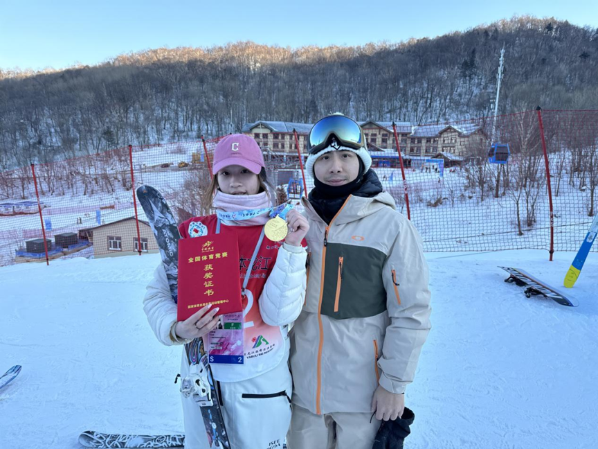 ▲自由式滑雪坡面障碍技巧项目女子组冠军肖思雨(左一)与教练陈杨合影