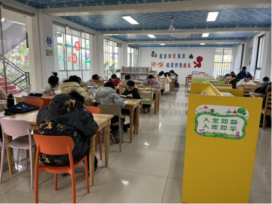 走进图书馆,浓郁的书香气息扑面而来,各个阅览区座无虚席,馆内火热的学习氛围和室外寒冷的天气形成鲜明对比。一楼借阅区,读者们或在书架前选书,或在自助还书机上借还书……井然有序,闲适自在;二楼少儿阅览室内,小读者们徜徉在书的海洋里,或仔细地挑选心仪的图书、或全神贯注地看书;三楼自习室,每天都是一座难求,大家或安静伏案认真书写、或手捧书卷出神阅读。