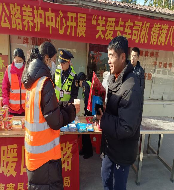 活动现场配备了热腾腾的姜茶、八宝粥、对联、小礼品及交通安全宣传各类资料等。执法人员穿上制服,主动亮明身份,为卡车司机普及交通安全知识,同时也倾听了司机们的心声与建议,为进一步优化交通运输执法服务收集宝贵意见,并送上暖心的姜糖水、对联、小礼品等。一杯热饮、一份礼品、一声祝福,温暖了过往的卡车司机心里。