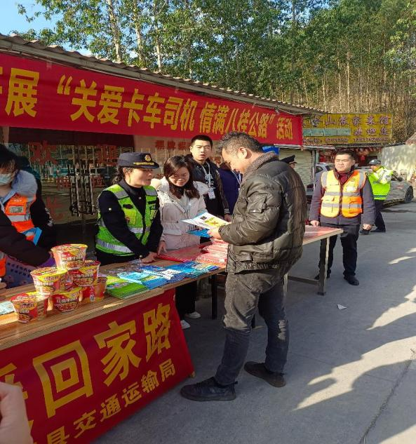 1月14日,一年一度的“春运”正式开始。鹿寨县交通运输综合执法大队联合鹿寨县交警大队、鹿寨县公路养护中心、鹿寨县交通运输服务中心,一起在G322国道司机之家开展“关爱卡车司机、情满八桂公路”活动,向奔波在运输一线的卡车司机送上春节的温暖和祝福。