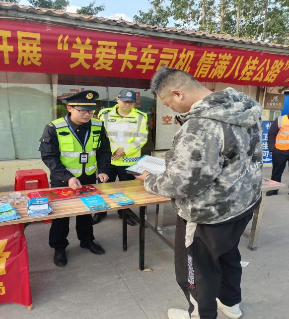 “师傅,送您一份交通安全知识手册,不要疲劳驾驶,安全第一哦。”