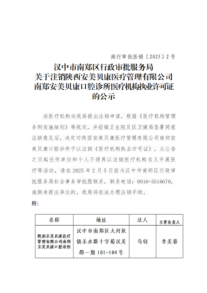 汉中市南郑区行政审批服务局关于注销陕西安美贝康医疗管理有限公司南郑安美贝康口腔诊所医疗机构执业许可证的公示