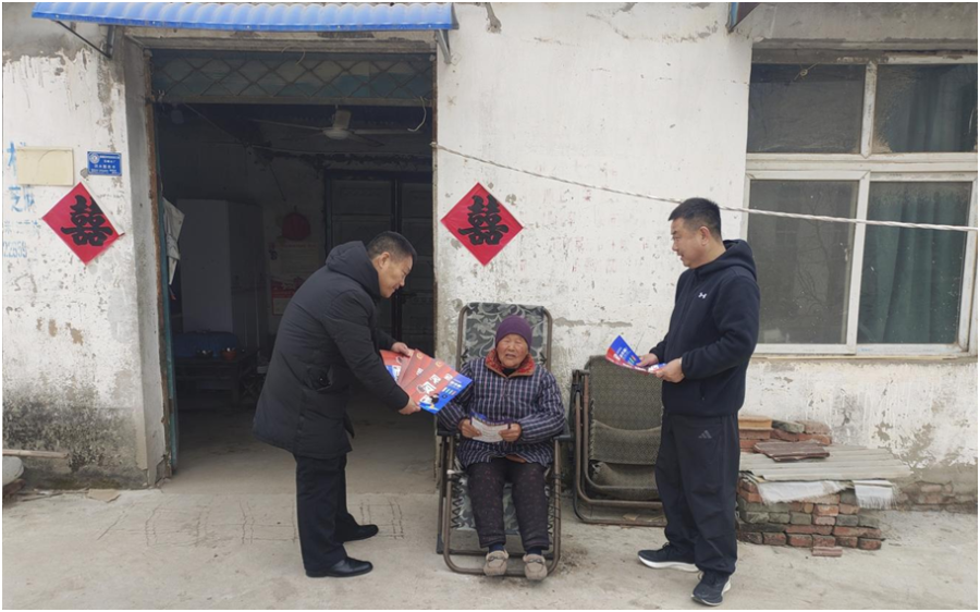 ;走村入户发放传单,开展防电诈、反邪教、禁毒、扫黑除恶等平安建设宣传教育,提高人民群众的安全意识和参与度,营造良好的社会氛围,增强群众的获得感、幸福感和满意度,确保人民群众过上和谐、稳定、欢快的春节。