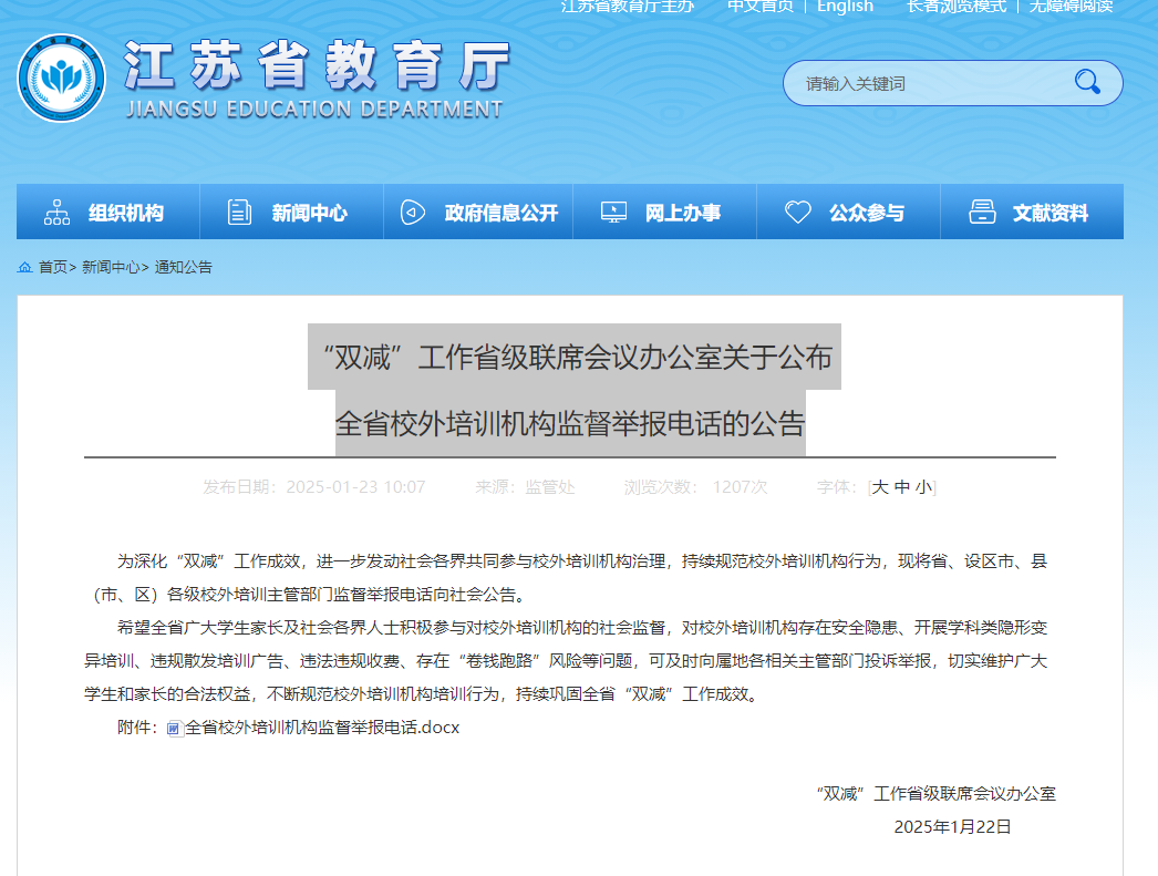 “双减”工作省级联席会议办公室关于公布全省校外培训机构监督举报电话的公告