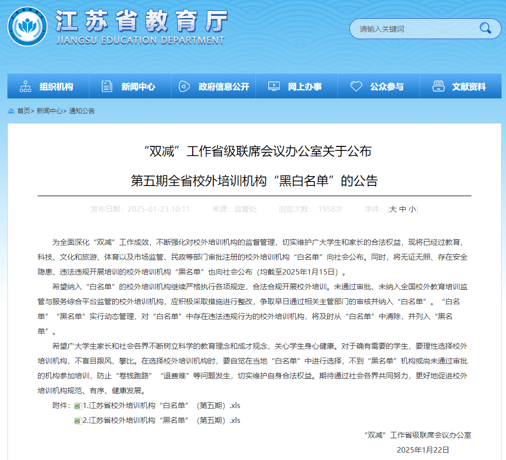 为全面深化“双减”工作成效,不断强化对校外培训机构的监督管理,切实维护广大学生和家长的合法权益,现将已经过教育、科技、文化和旅游、体育以及市场监管、民政等部门审批注册的校外培训机构“白名单”向社会公布。同时,将无证无照、存在安全隐患、违法违规开展培训的校外培训机构“黑名单”也向社会公布(均截至2025年1月15日)。