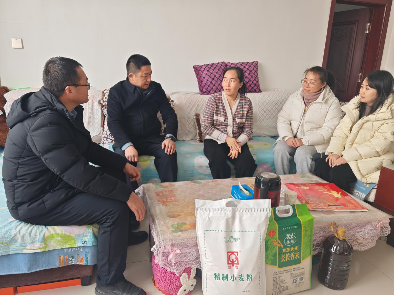 在结对关爱对象和困难群众家中,面对面交流,心贴心交谈,详细了解他们的身体健康情况、生产生活状况及存在的困难,查看年货准备、就医问诊、医药费报销等情况,为他们送去米面粮油等慰问品。并叮嘱大家要注意用气用电安全,要高度重视防范农村一氧化碳中毒工作,过一个欢乐祥和的春节,切实把党和政府的温暖和祝福送到群众心中。