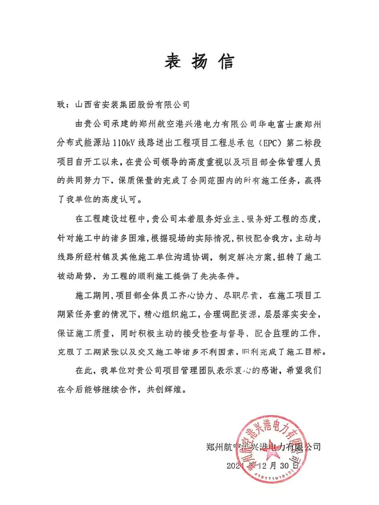 此外,在郑州航空港兴港电力有限公司华电富士康郑州分布式能源站110kV线路送出工程项目工程总承包(EPC)第二标段项目中,项目部也凭借优质的服务态度和高效的施工能力,成功完成了合同范围内的所有施工任务。在施工过程中,项目部积极配合业主单位,主动沟通协调,制定解决方案,扭转了施工被动局势,为工程的顺利施工提供了先决条件。