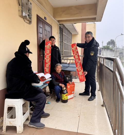 活动中执法人员为残疾人家庭送去了米油等生活物资,帮助他们张贴新春对联及年画,同时向他们普及了秸秆禁烧、动物防疫、农产品质量安全等相关法律知识。