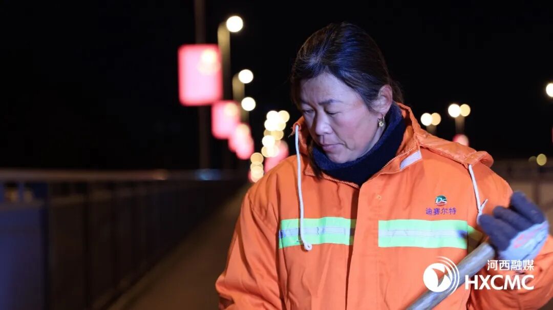 凌晨四点,当人们还在沉睡时,河西环卫机扫队郝想云已经穿上厚厚的棉衣和工服,在她负责的紫金山路辖区,开始了一天的扫保。今年是她在岗位上度过的第六个春节了。