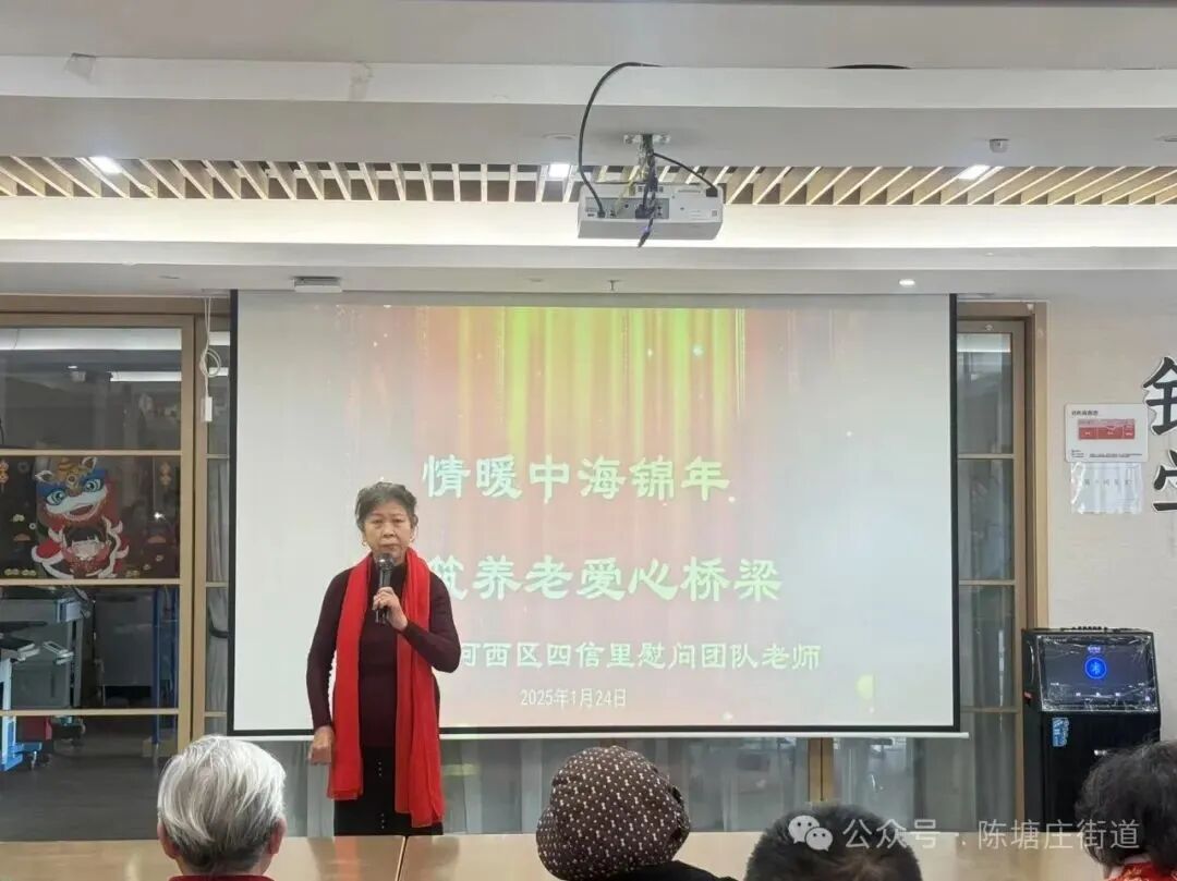 陈塘庄街四信里社区联合中海物业开展“情暖中海锦年,共筑养老爱心桥梁”主题活动。一首诗朗诵《卜算子·咏梅》拉开了活动的序幕,群舞《苹果香》、京剧《红灯记》选段等精彩节目让现场氛围逐渐升温,工作人员向老人们发放福字,祝福老人阖家欢乐、健康长寿。
