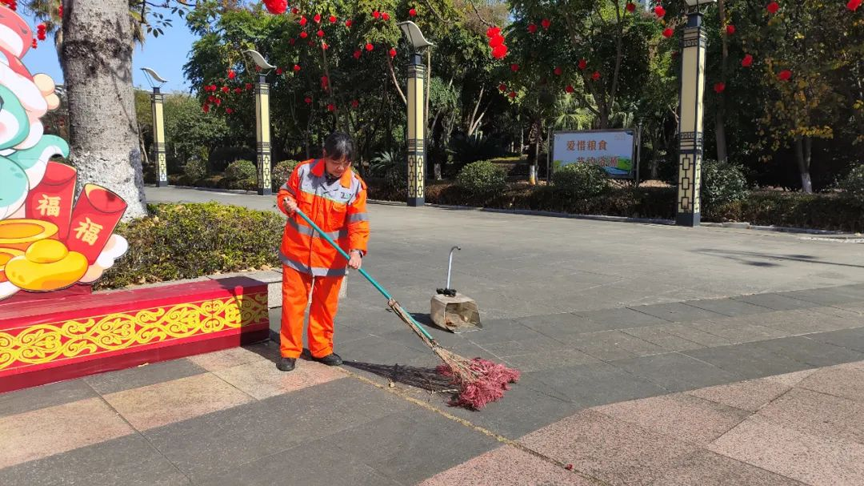 春节假期的鹿寨街道,行人车辆相较平时少了不少,但在各条大街小巷依然能看到环卫工人忙碌的身影,他们像平时一样在各自的工作区域清扫着路面,用自己的行动守护着鹿寨的干净整洁,身上那套橙黄色的工作服为街道增添了一抹靓丽的色彩。