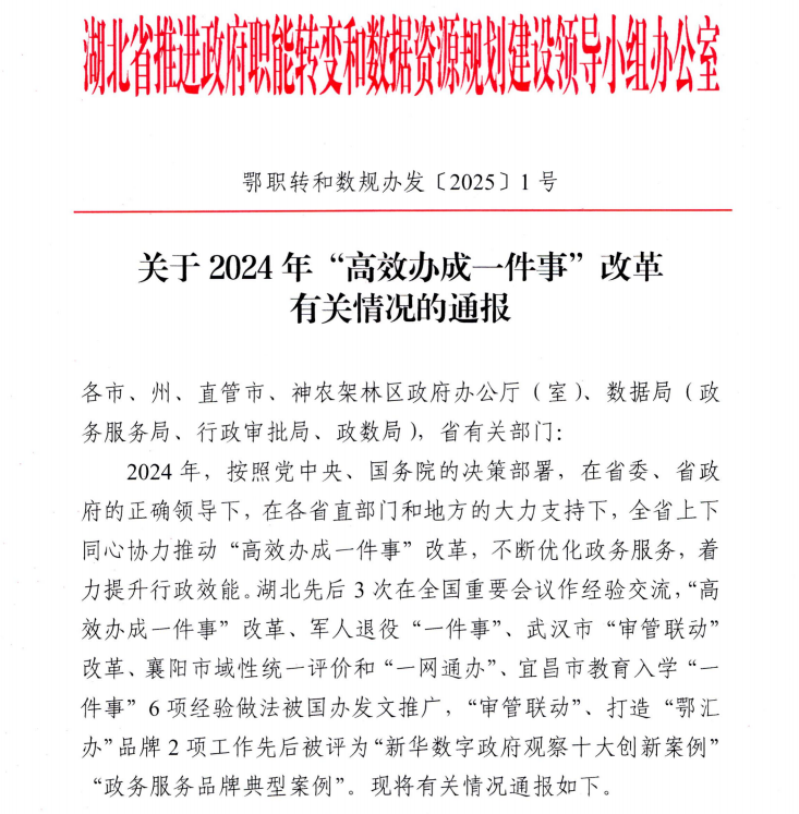 1月26日,省推进政府职能转变和数据资源规划建设领导小组办公室印发《关于2024年“高效办成一件事”改革有关情况的通报》,确定了全省21个2024年度“高效办成一件事”改革典型案例,其中华容区“打造区镇联动、城乡融合、政企互动‘容易办’服务品牌”成功入选。