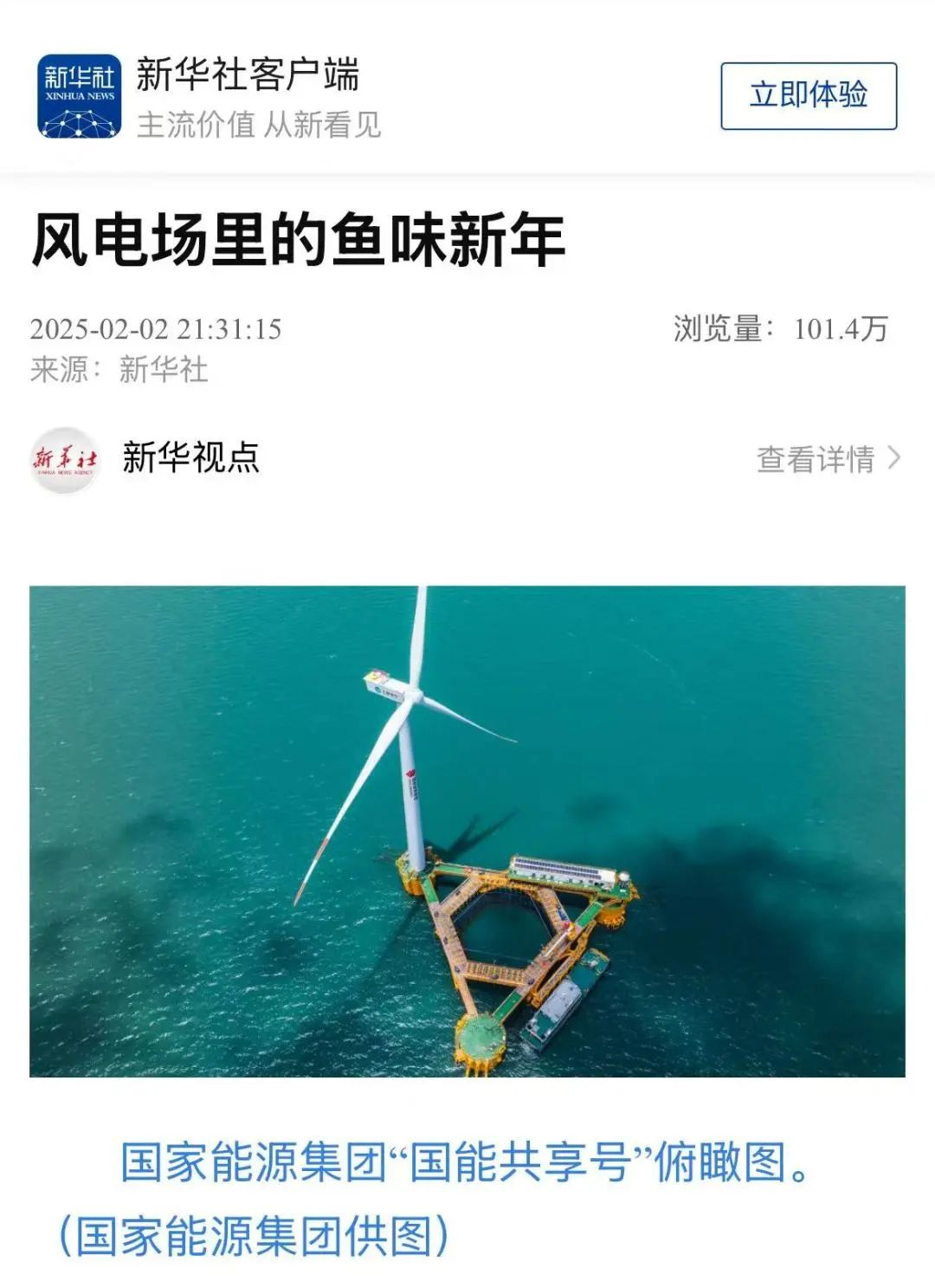 2月1日,新华社客户端刊发新闻《风电场里的鱼味新年》,记者驶向全球首座风渔融合浮式平台——“国能共享号”,实地探寻风电场里的渔获情况——