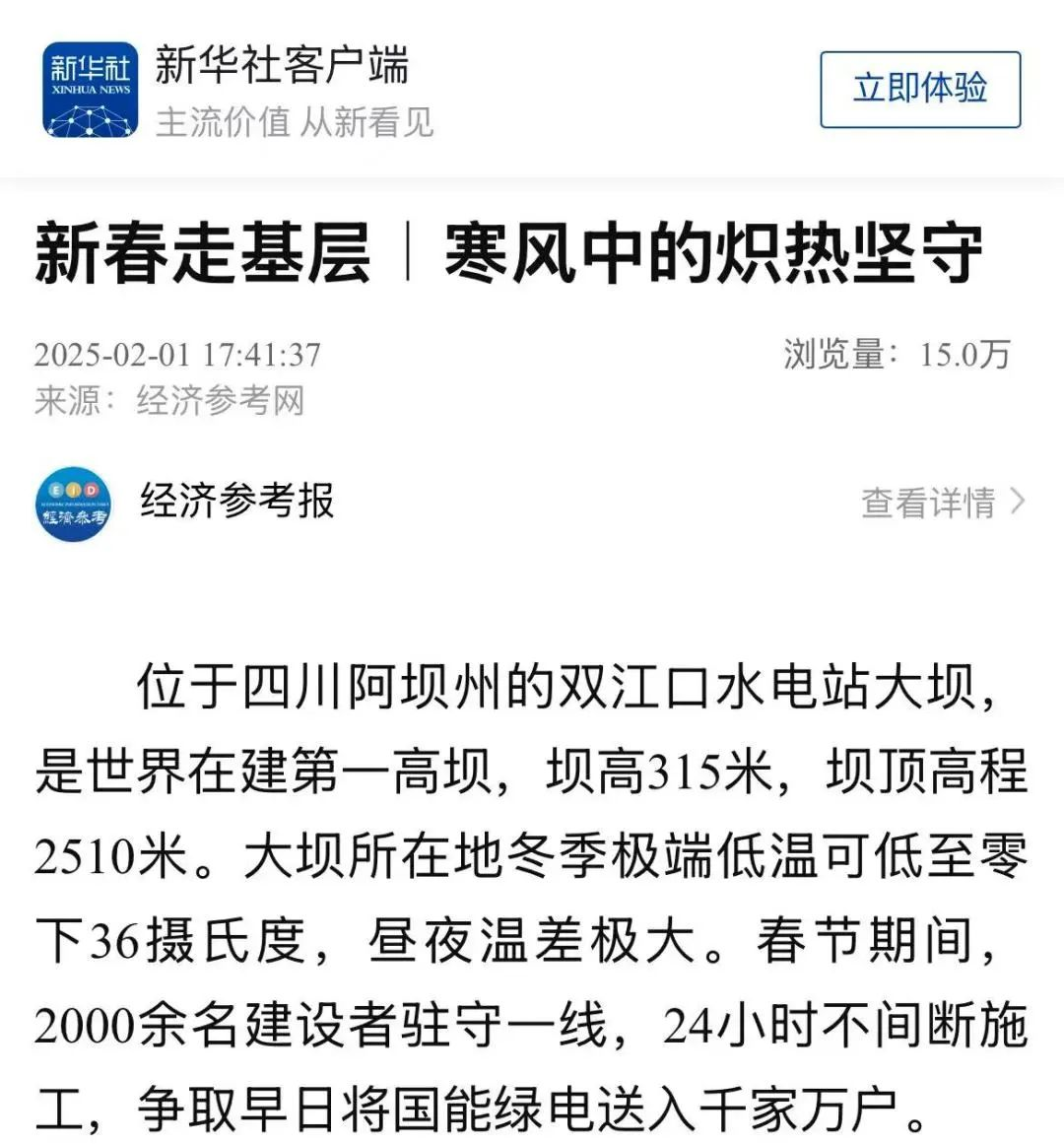 2月1日,新华社客户端刊发新闻《寒风中的炽热坚守》,记者与建设者们一同见证和庆祝了春节期间的工程进度——
