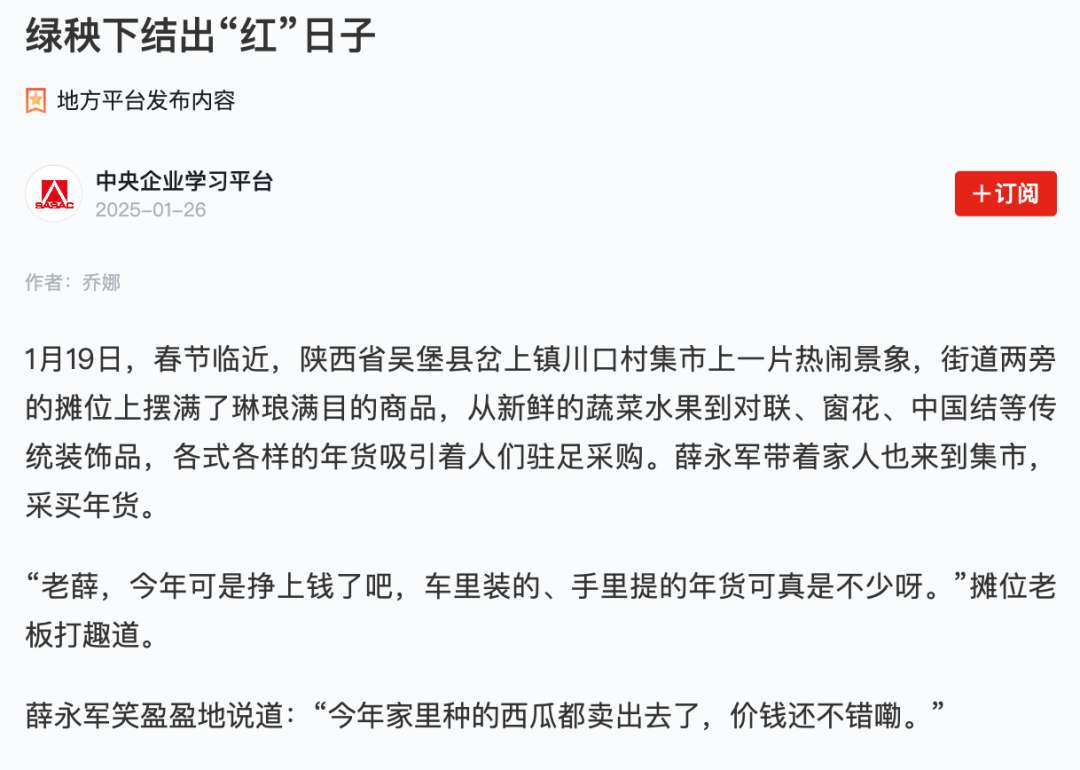 1月26日,学习强国中央企业学习平台刊发新闻《绿秧下结出“红”日子》,报道在国家能源集团神东煤炭帮助下,陕西省吴堡县岔上镇川口村西瓜产业迎来新发展。