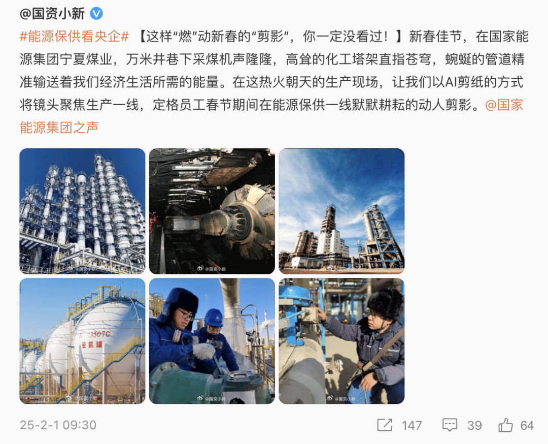 2月1日,国资小新微博发布推文【这样“燃”动新春的“剪影”,你一定没看过!】以AI剪纸的方式将镜头聚焦宁夏煤业的生产一线——