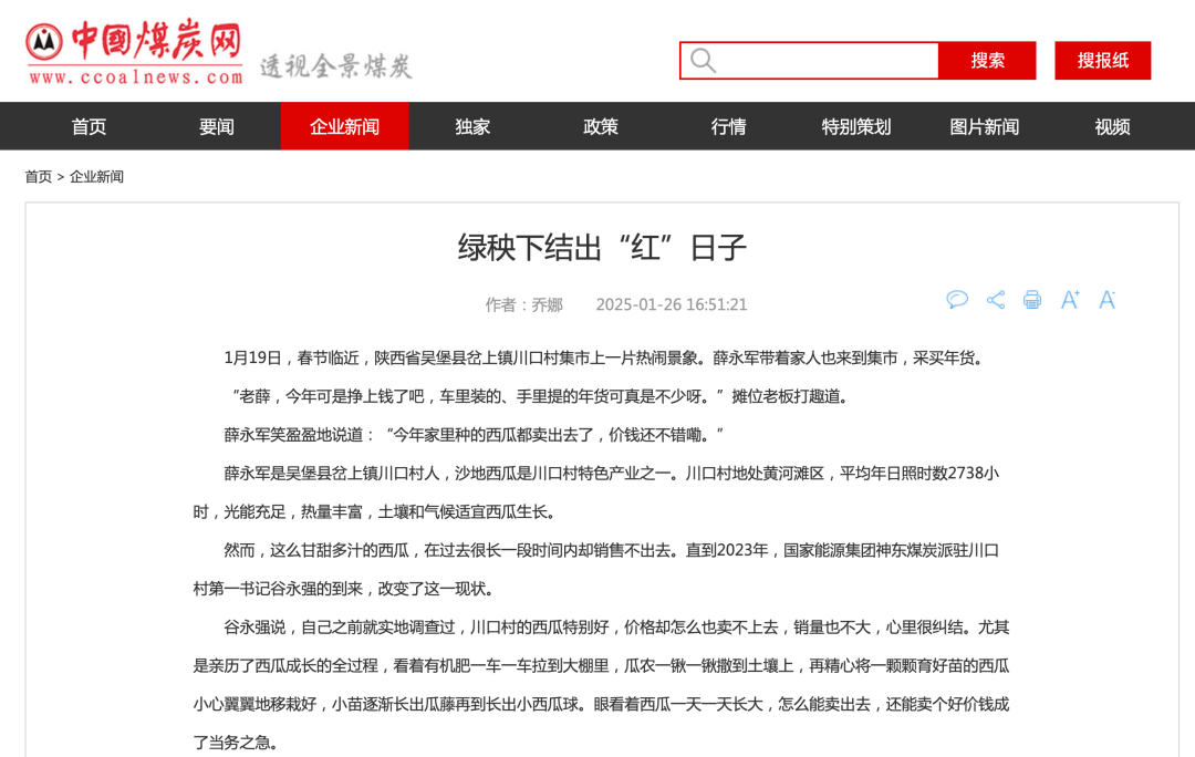 1月26日,中国煤炭网刊发新闻《绿秧下结出“红”日子》,报道在国家能源集团神东煤炭帮助下,陕西省吴堡县岔上镇川口村西瓜产业迎来新发展。