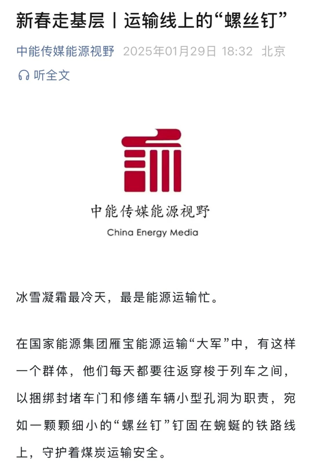 1月29日,中能传媒能源视野刊发新闻《新春走基层丨运输线上的“螺丝钉”》,报道国家能源集团雁宝能源装车工在铁路线上发挥装车职责,每天奋战在铁路线后方,在能源运输线上默默守护。