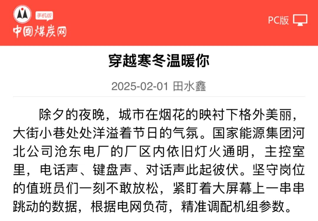 2月1日,中国煤炭报刊发新闻《穿越寒冬温暖你》,报道国家能源集团河北公司沧东电厂除夕夜坚守岗位的值班员们一刻不敢放松,紧盯着大屏幕上一串串跳动的数据,根据电网负荷,精准调配机组参数。