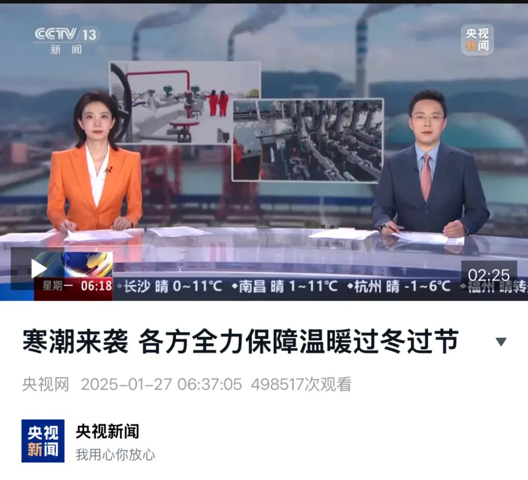 1月27日,总台央视综合频道(CCTV-1)和新闻频道(CCTV-13)并机直播的6点档《朝闻天下》栏目,播发《寒潮来袭 各方全力保障温暖过冬过节》新闻,报道寒潮下,国家能源集团宁夏煤业、湖南永州电厂的能源保供情况,并对集团员工进行同期声采访——