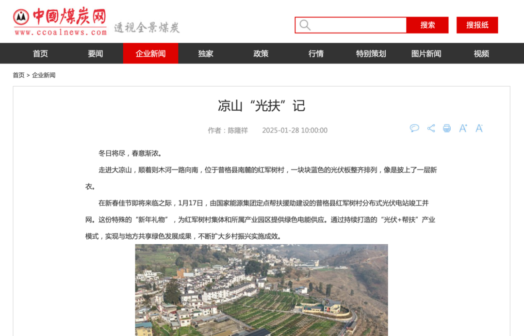 1月28日,中国煤炭网刊发新闻《凉山“光扶”记》,报道由国家能源集团定点帮扶援助建设的普格县红军树村分布式光伏电站竣工并网,为红军树村集体和所属产业园区提供绿色电能供应。通过持续打造的“光伏+帮扶”产业模式,实现与地方共享绿色发展成果,不断扩大乡村振兴实施成效。
