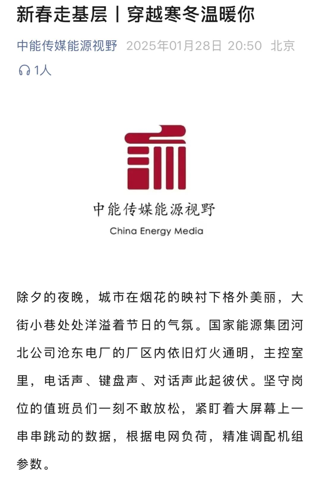 1月28日,中能传媒能源视野刊发新闻《新春走基层丨穿越寒冬温暖你》,报道国家能源集团河北公司沧东电厂除夕夜坚守岗位的值班员们一刻不敢放松,紧盯着大屏幕上一串串跳动的数据,根据电网负荷,精准调配机组参数。