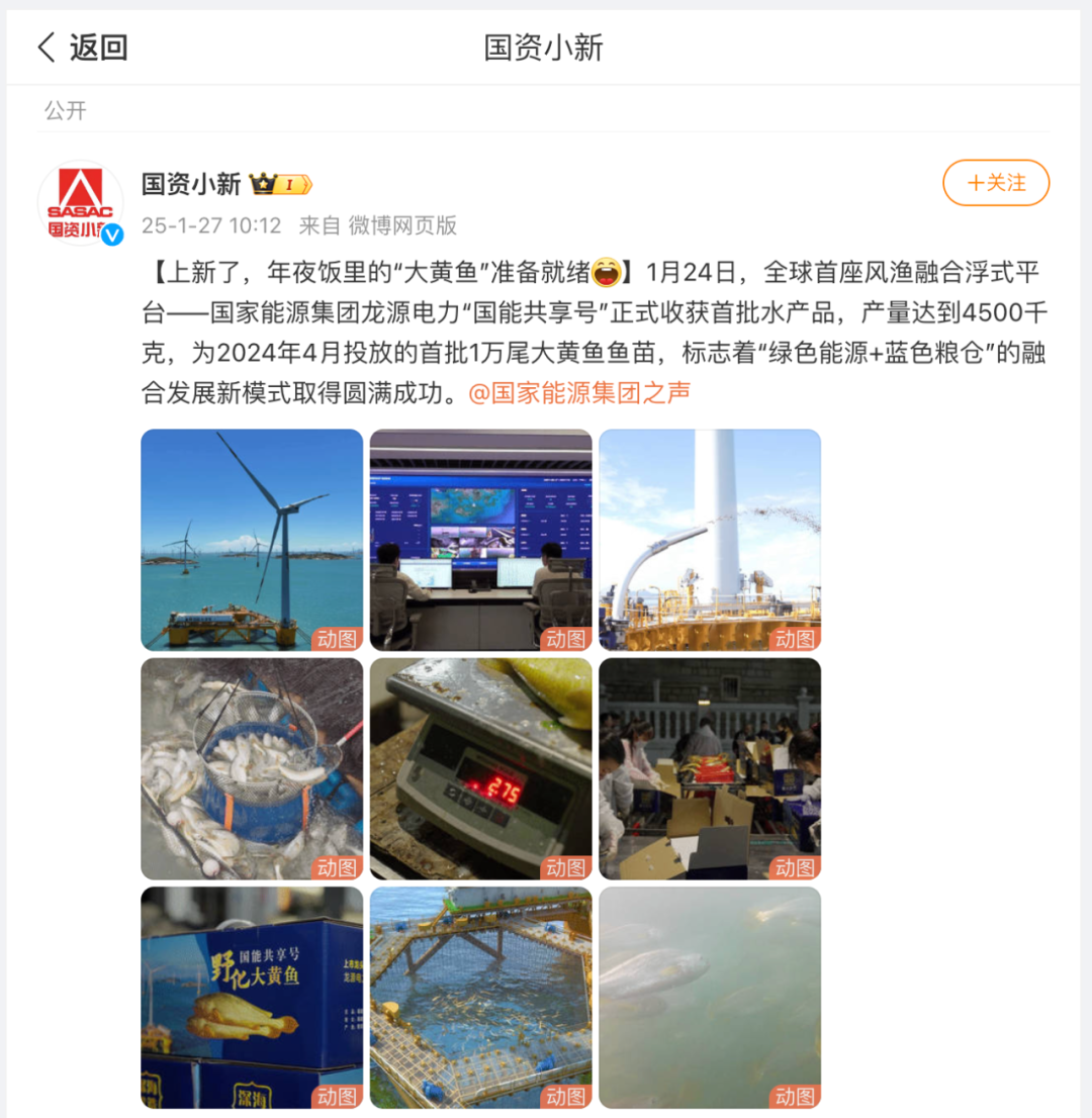 1月27日,国资小新微博发布《上新了,年夜饭里的“大黄鱼”准备就绪》,报道全球首座风渔融合浮式平台——国家能源集团龙源电力“国能共享号”正式收获首批水产品。