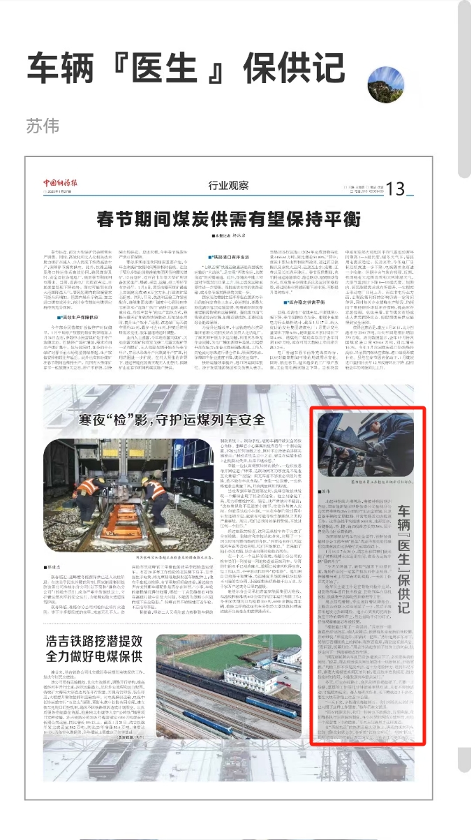 1月27日,中国能源报刊发新闻《车辆医生保供记》,报道铁路装备榆林分公司车辆“医生”们坚守岗位,守护运煤车辆安全,让新春佳节更加温暖。