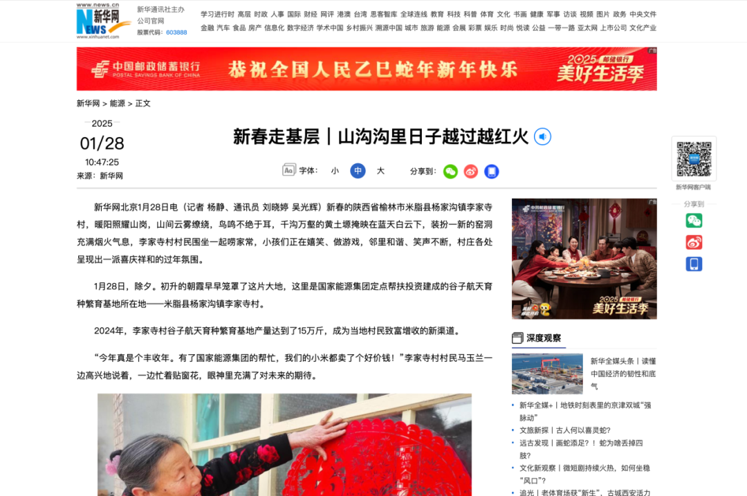 1月28日,新华网刊发新闻《新春走基层|山沟沟里日子越过越红火》,报道国家能源集团在对米脂县的定点帮扶中,立足米脂县实际,围绕加快乡村产业振兴,打响农产品品牌,与米脂县的老百姓携手共进,促进帮扶地区产业发展和农民群众稳定增收“双提升”。