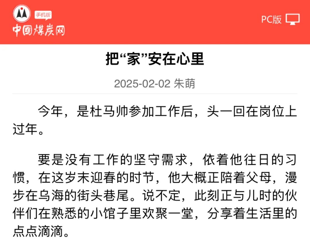 2月2日,中国煤炭报刊发新闻《把“家”安在心里》,报道国家能源集团上湾煤矿春节期间坚守岗位保障生产的员工故事。