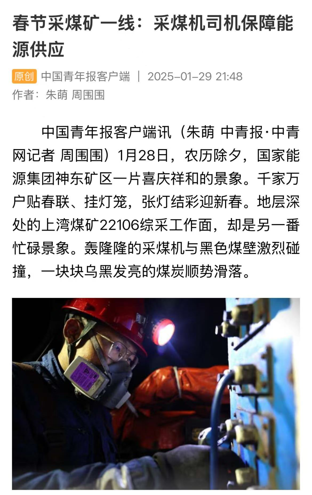 1月29日,中国青年报刊发新闻《春节采煤矿一线:采煤机司机保障能源供应》,报道随着国家能源集团智能矿山建设的加速推进,智能化设备的广泛应用,采煤工作变得更加高效、安全。