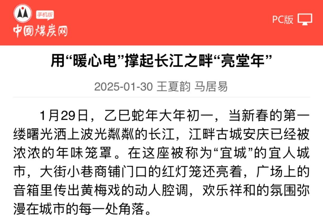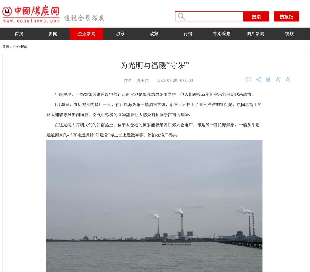 1月30日,中国煤炭报刊发新闻《用“暖心电”撑起长江之畔“亮堂年”》,报道国家能源集团安庆电厂的电力人在春节期间坚守岗位,用实干和奉献书写着别样的“年味”。源源不断的“暖心电”从这里输送到千家万户,为人民的春节生活撑起了一片“亮堂年”。