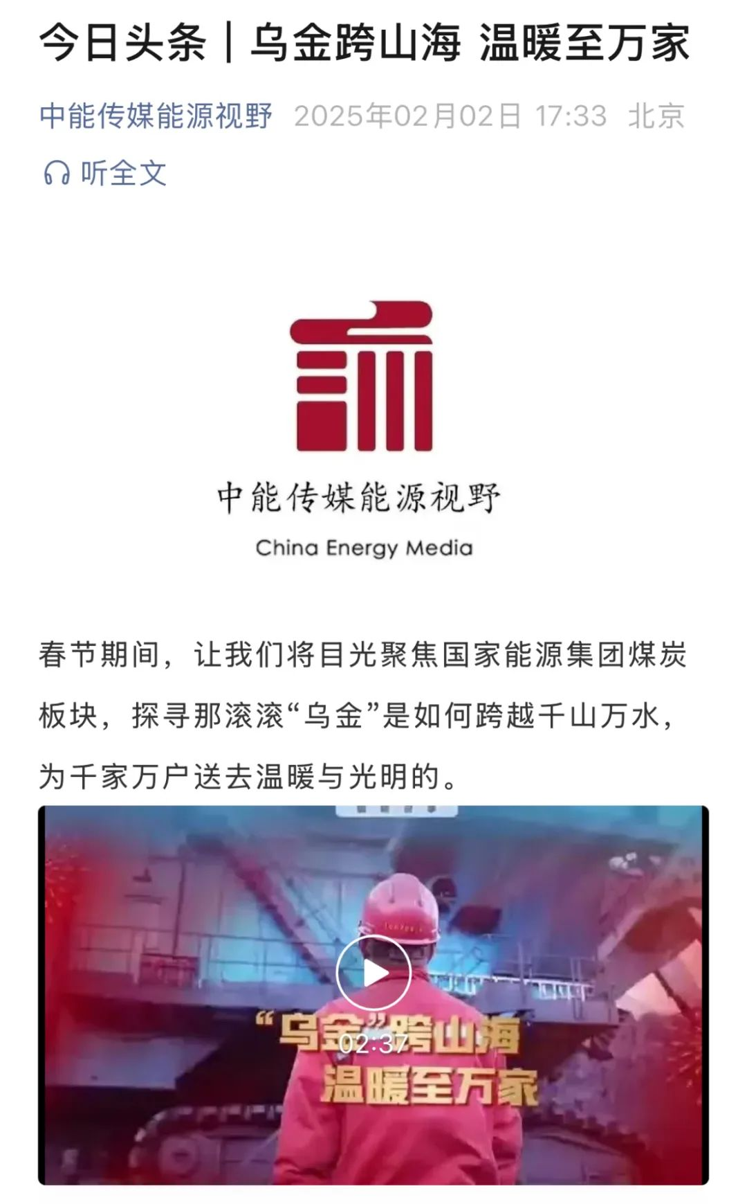 2月2日中能传媒能源视野刊发视频《今日头条 | 乌金跨山海 温暖至万家》,聚焦国家能源集团煤炭板块,探寻那滚滚“乌金”是如何跨越千山万水,为千家万户送去温暖与光明的。