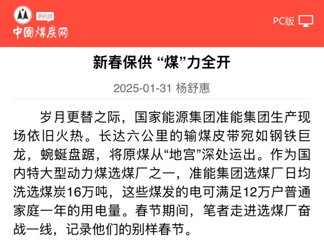 1月31日,中国煤炭报刊发新闻《新春保供“煤”力全开》,报道国家能源集团准能集团春节期间生产现场依旧火热。长达六公里的输煤皮带宛如钢铁巨龙,蜿蜒盘踞,将原煤从“地宫”深处运出。作为国内特大型动力煤选煤厂之一,准能集团选煤厂日均洗选煤炭16万吨,这些煤发的电可满足12万户普通家庭一年的用电量。