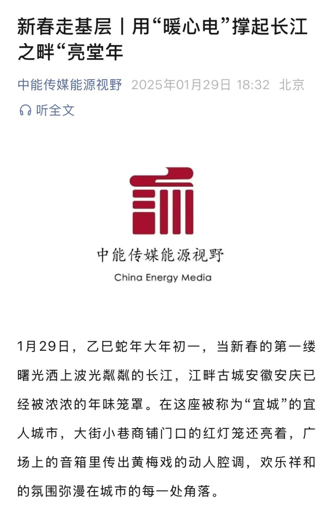 1月29日,中能传媒能源视野刊发新闻《新春走基层丨用“暖心电”撑起长江之畔“亮堂年”》,报道国家能源集团安庆电厂的电力人在春节期间坚守岗位,用实干和奉献书写着别样的“年味”。源源不断的“暖心电”从这里输送到千家万户,为人民的春节生活撑起了一片“亮堂年”。