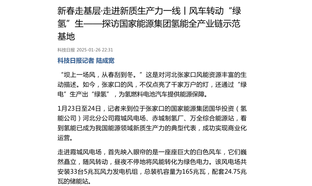 1月26日,科技日报客户端发布报道《新春走基层·走进新质生产力一线丨风车转动“绿氢”生——探访国家能源集团氢能全产业链示范基地》,走近国家能源集团国华投资(氢能公司)河北分公司的绿氢产业链——