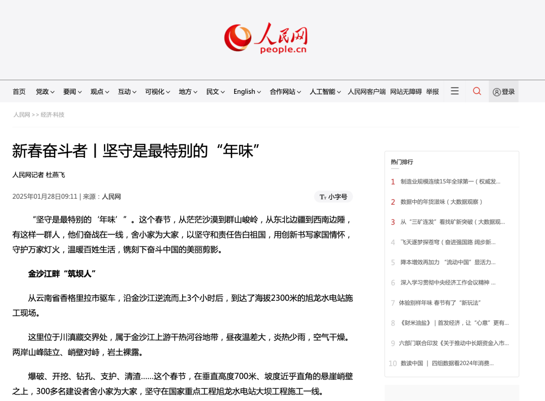 1月28日,人民网首页刊发新闻《新春奋斗者丨坚守是最特别的“年味”》,记者走进海拔2300米的旭龙水电站施工现场,见证300多名建设者舍小家为大家,坚守在国家重点工程旭龙水电站大坝工程施工一线。