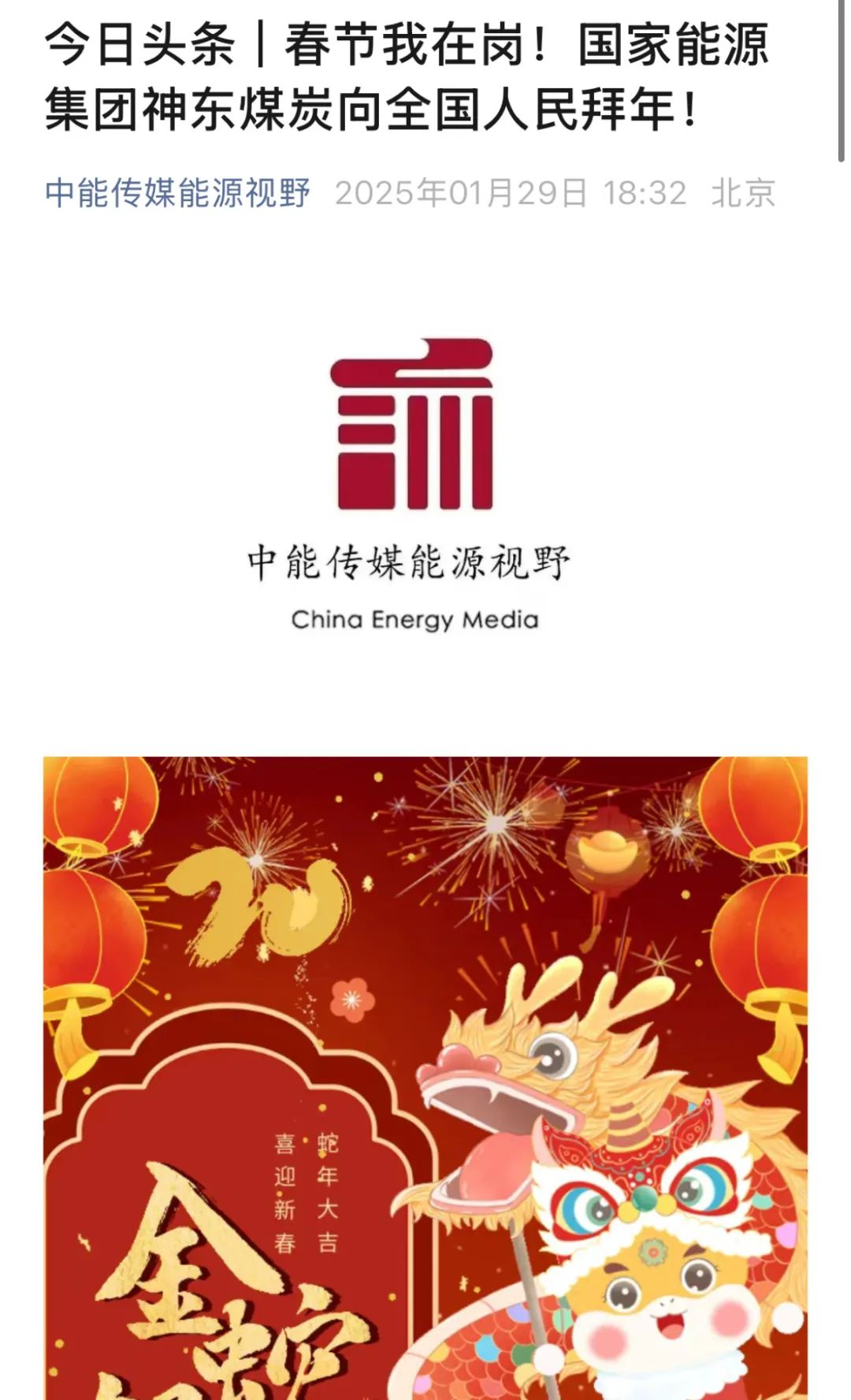 1月29日,中能传媒能源视野刊发新闻《今日头条丨国家能源集团神东煤炭向全国人民拜年!》,报道国家能源集团神东煤炭在春节期间安全生产不打烊、创新驱动不打烊、后勤保障不打烊、能源保供不打烊、设备维修不打烊、洗选外运不打烊。