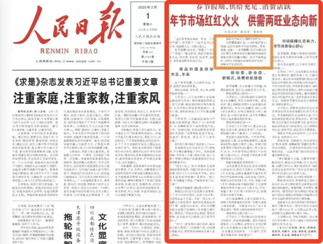 2月1日,人民日报头版刊发新闻《年节市场红红火火 供需两旺业态向新》,报道春节假期商品和服务供给充足,能源生产加马力,保障万家灯火——