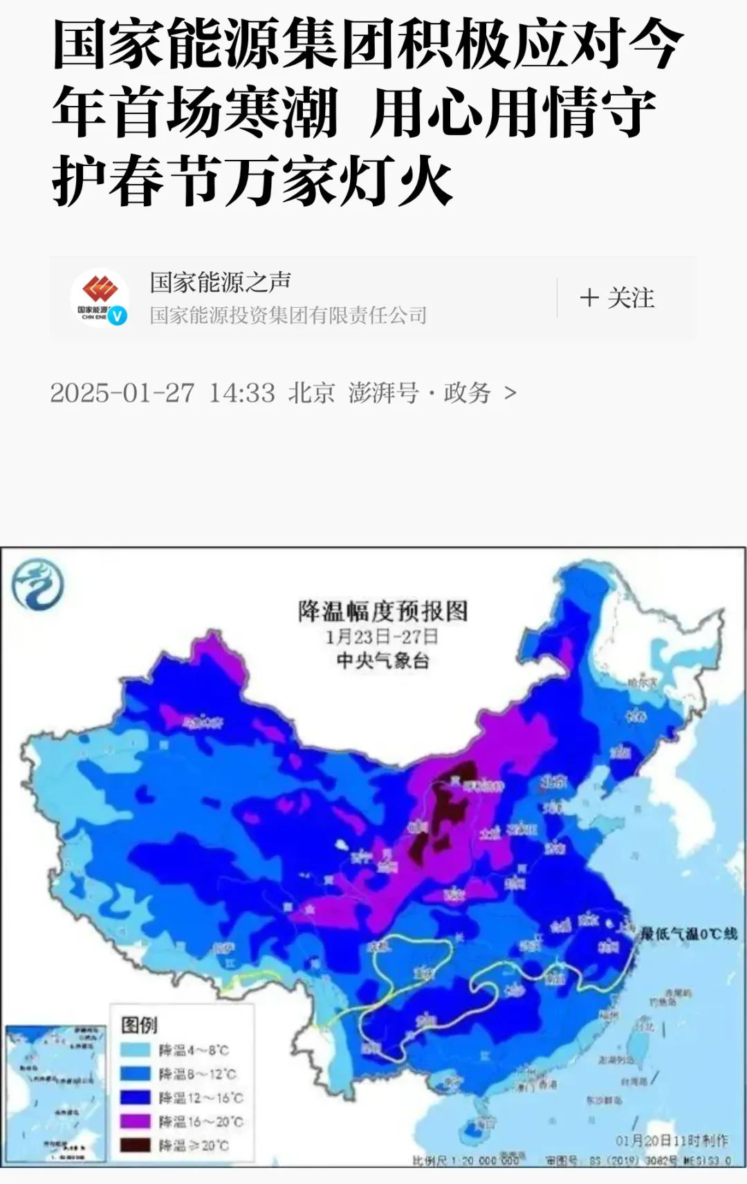 1月27日,澎湃新闻刊发新闻《国家能源集团积极应对今年首场寒潮 用心用情守护春节万家灯火》,介绍国家能源集团在寒潮期间的多项重点防范举措。