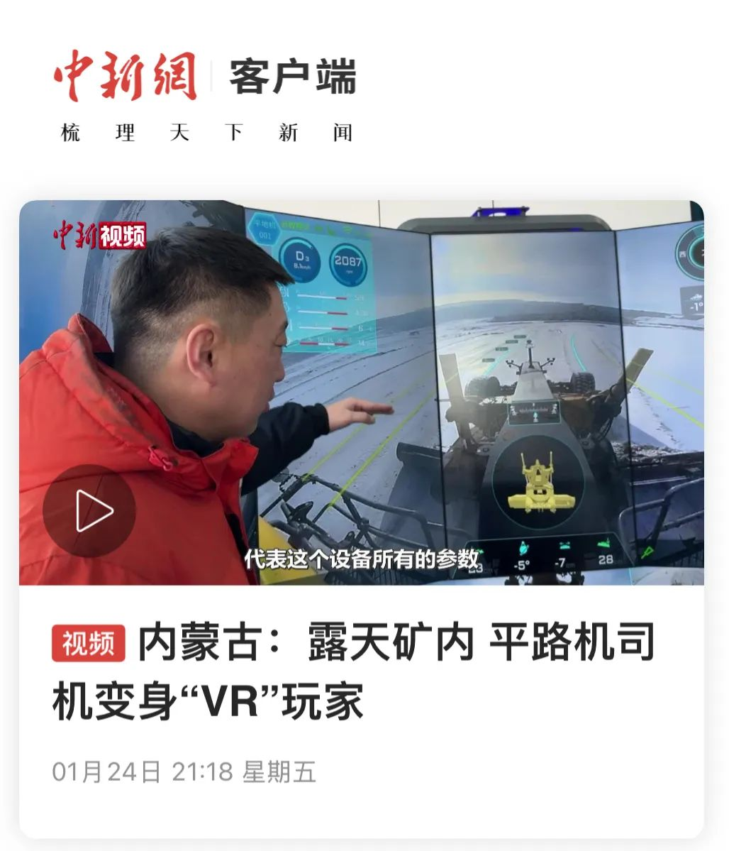 1月24日,中国新闻社刊发视频《露天矿内 平路机司机变身“VR”玩家》,介绍雁宝能源宝日希勒露天矿生产区内的无人驾驶设备——