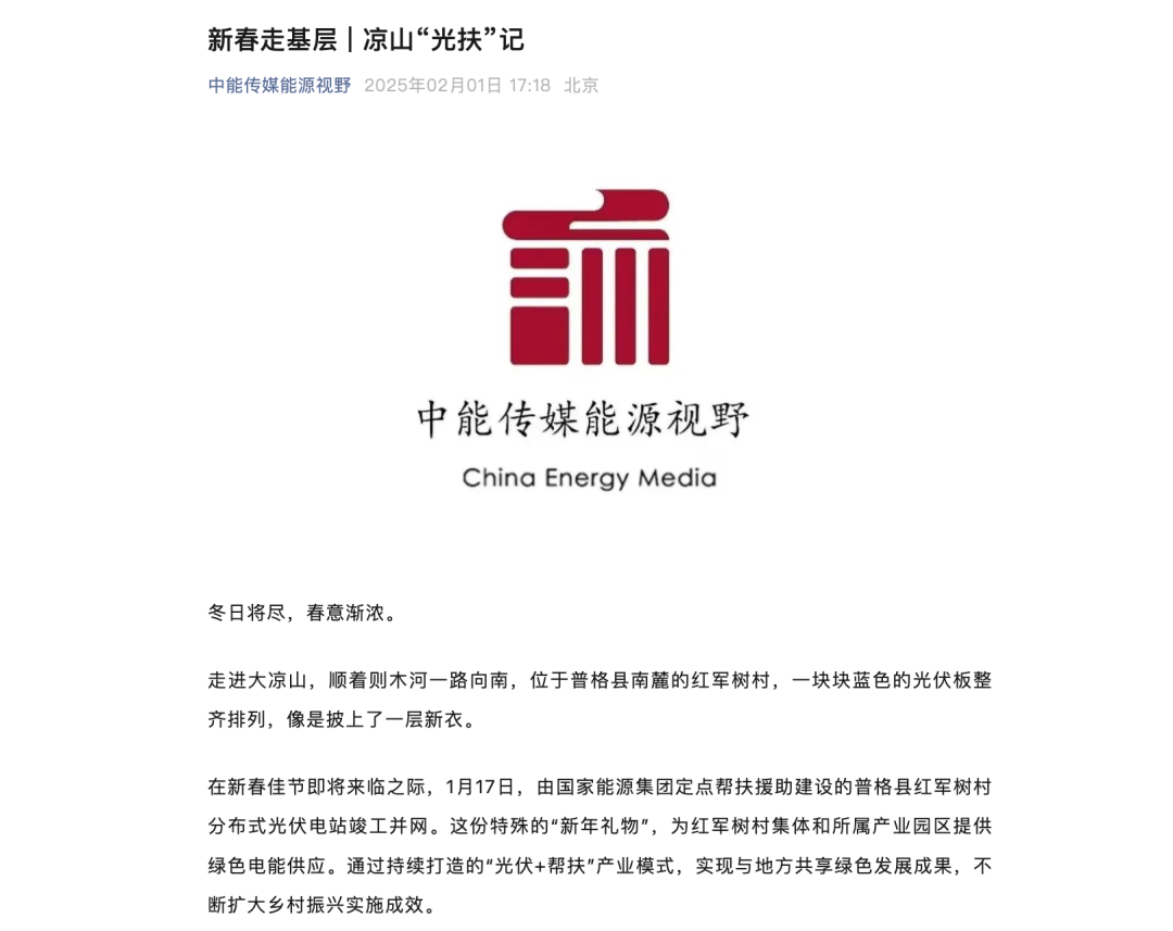 2月1日,中能传媒能源视野刊发新闻《新春走基层 | 凉山“光扶”记》,报道由国家能源集团定点帮扶援助建设的普格县红军树村分布式光伏电站竣工并网,为红军树村集体和所属产业园区提供绿色电能供应。通过持续打造的“光伏+帮扶”产业模式,实现与地方共享绿色发展成果,不断扩大乡村振兴实施成效。