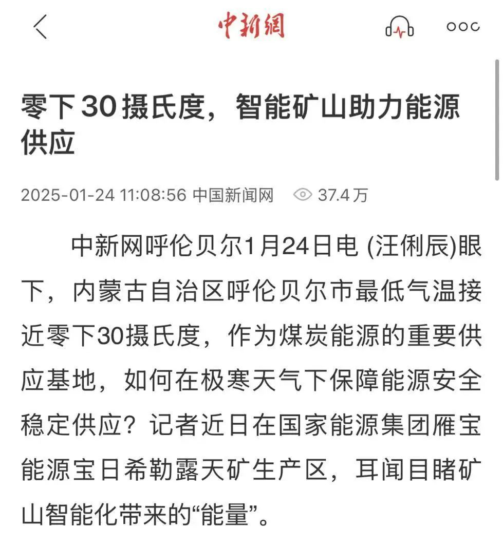 1月24日,中国新闻社刊发新闻《零下30摄氏度,智能矿山助力能源供应》,报道人工智能和5G网络给煤矿带来了新生机——