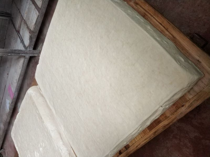 制作腐乳的第一步,是打豆腐。传统的柴火豆腐更扎实,还能吃出来‘锅’味儿,这也是‘罗大姐豆腐乳’的第一层味儿。“石膏水和豆腐在一瞬间就能发出反应,因此冲浆的时候动作要快。压豆腐也要压得干一点,市面上的豆腐水分都太足了。”
